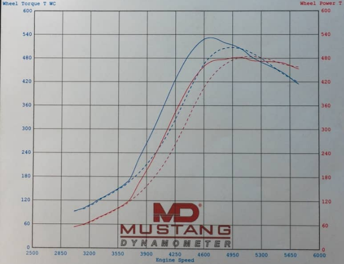Peak power was 532AWHP and 484FtLbs. Keep in mind this was on a Mustang dyno which reads ~12% lower than a Dynojet.